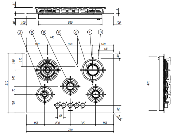 바라짜 무드 블랙 5구 가스쿡탑 75cm Barazza Mood hob Gas Cooktop Black 1PMD70N