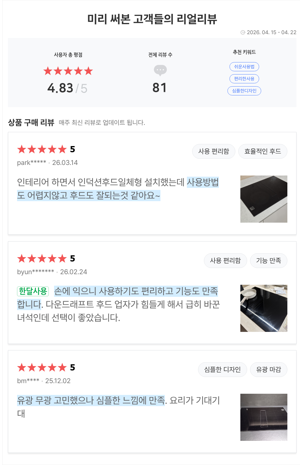 역시 기대한 것과 같이 물건이 너무 좋네요. 게다가 배송이랑 응대가 정말 굿. 배송 날짜를 맞추기가 어려워 여러번 문의를 하였는데도 전화할때마다 너무 친절하게 안내해 주셨어요. 덕분에 날짜 잘 맞춰서 안전하게 배송, 설치되었습니다. 디자인이 제일 좋지만 후드흡입력도 좋고 성능도 대만족입니다. 잘 쓸게요 감사합니다